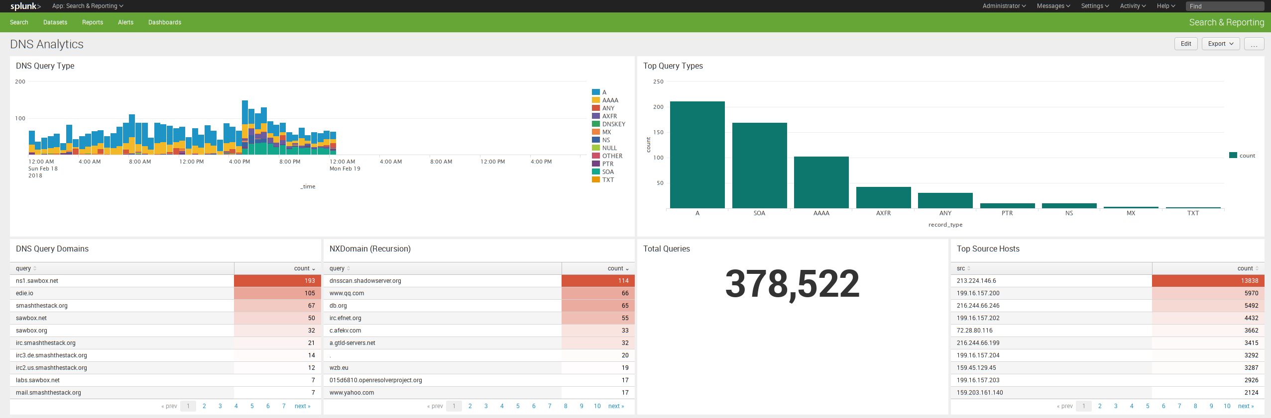 Here is a glimpse of a splunk dashboard I created for bind query logs: